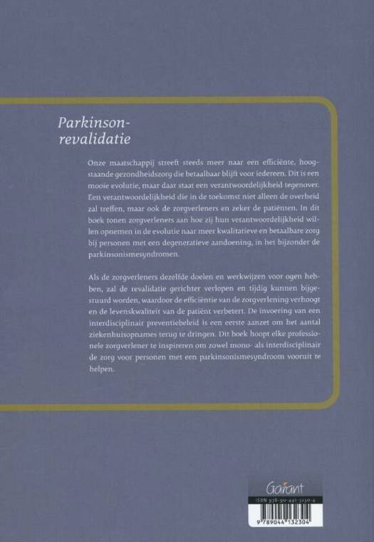 Als de zorgverleners dezelfde doelen en werkwijzen voor ogen hebben, zal de revalidatie gerichter verlopen en tijdig kunnen bijgestuurd worden, waardoor de efficiëntie van de zorgverlening verhoogt en de levenskwaliteit van de patiënt verbetert. De invoering van een interdisciplinair preventiebeleid is een eerste aanzet om het aantal ziekenhuisopnames terug te dringen. Dit boek hoopt elke professionele zorgverlener te inspireren om zowel mono- als interdisciplinair de zorg voor personen met een parkinsonismesyndroom vooruit te helpen.