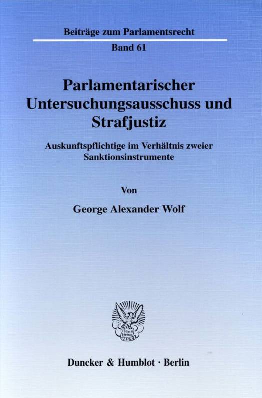 Ziel der vorliegenden Untersuchung ist es, die Stellung von Auskunftspflichtigen im Verhältnis von parlamentarischen und strafverfahrensrechtlichen Untersuchungen zu klären. In der Beweiserhebung des Parteispendenausschusses des 14. Bundestages hat nahezu jeder fünfte Zeuge seine Aussage aufgrund paralleler Untersuchungen der Strafjustiz verweigert. Die Effektivität der Untersuchungsausschüsse hat durch diese Beschränkung der Beweiserhebung starken Schaden genommen. Die Auseinandersetzung mit diesem Themenkreis ist bisher weitgehend aus der Rechtsposition der Zeugen heraus bestimmt worden. Demgegenüber nähert sich George Alexander Wolf diesem Problem in seiner Dissertation vor allem unter Berücksichtigung der Wirksamkeit der parlamentarischen Untersuchungsausschüsse. Die Arbeit ist chronologisch aufgebaut: