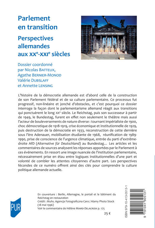 L’histoire de la démocratie allemande est d’abord celle de la construction de son Parlement fédéral et de sa culture parlementaire. Ce processus fut progressif, non-linéaire et jonché d’obstacles, et c’est pourquoi ce dossier interroge la façon dont le parlementarisme allemand réagit aux transitions qui ponctuèrent le long XXe siècle. Le Reichstag, puis son successeur à partir de 1949, le Bundestag, furent en effet non seulement le théâtre mais aussi l’acteur de bouleversements de nature diverse : tournant impérialiste de 1900, choc démocratique de 1918-1919, crise économique et institutionnelle de 1929, puis destruction de la démocratie en 1933, reconstruction de cette dernière sous l’ère Adenauer, mobilisation étudiante de 1968, réunification de 1989-1990, prise de conscience de l’urgence climatique, entrée du parti d’extrême droite AfD (Alternative für Deutschland) au Bundestag… Les articles et les commentaires de sources analysent les réponses apportées par le Parlement à ces événements. En ressort une image nuancée de l’institution parlementaire, nécessairement prise en étau entre logiques institutionnelles d’une part et volonté de combler les attentes citoyennes d’autre part. Les perspectives fécondes de ce numéro offrent ainsi des clés pour comprendre la culture politique allemande actuelle.