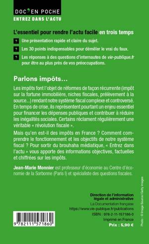 Au format poche, pédagogique et facile d’accès, avec un vocabulaire technique explicité, ce livre présente les réponses aux 30 questions que tout citoyen se pose sur les impôts et la fiscalité en s’appuyant sur les faits et les chiffres connus.