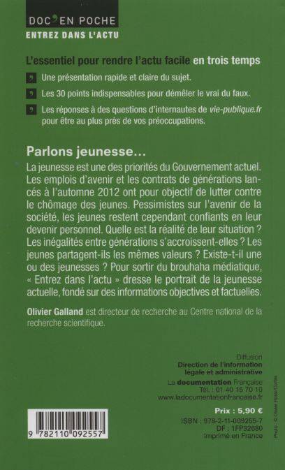 La jeunesse est une des priorités du Gouvernement actuel. Les emplois d'avenir et les contrats de générations lancés à l'automne 2012 ont pour objectif de lutter contre le chômage des jeunes. Pessimistes sur l'avenir de la société, les jeunes restent cependant confiants en leur devenir personnel. Quelle est la réalité de leur situation ? Les inégalités entre générations s'accroissent-elles ? Les jeunes partagent-ils les mêmes valeurs ? Existe-t-il une ou des jeunesses ? Pour sortir du brouhaha médiatique, « Entrez dans l'actu » dresse le portrait de la jeunesse actuelle, fondé sur des informations objectives et factuelles.