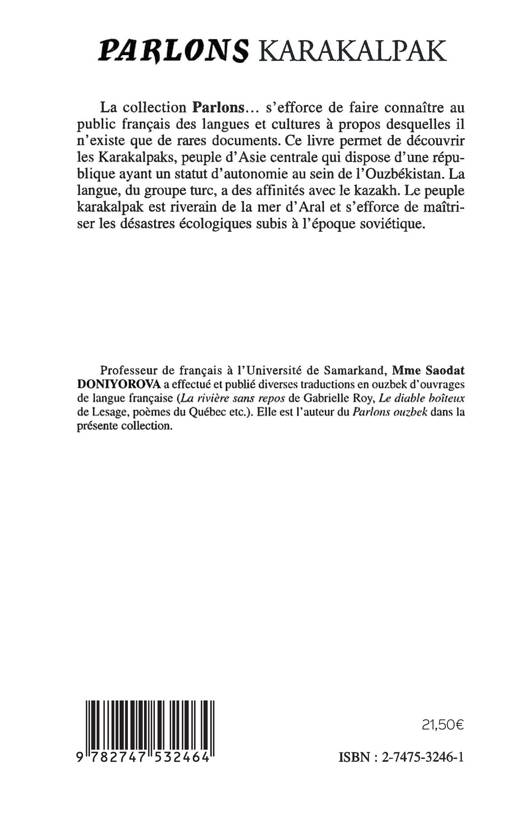 Ce livre permet de découvrir les Karakalpaks, peuple d'Asie centrale qui dispose d'une république ayant un statut d'autonomie au sein de l'Ouzbékistan. La langue, du groupe turc, a des affinités avec le kazakh. Le peuple karakalpak est riverain de la mer d'Aral et s'efforce de maîtriser les désastres écologiques subis à l'époque soviétique.