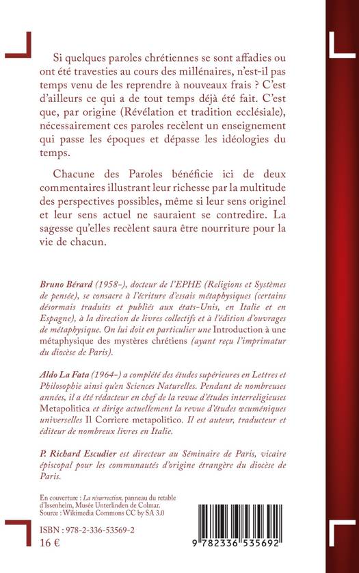 Si quelques paroles chrétiennes se sont affadies ou ont été travesties au cours des millénaires, n'est-il pas temps venu de les reprendre à nouveaux frais ? C'est d'ailleurs ce qui a de tout temps déjà été fait. C'est que, par origine (Révélation et tradition ecclésiale), nécessairement ces paroles recèlent un enseignement qui passe les époques et dépasse les idéologies du temps. Chacune des Paroles bénéficie ici de deux commentaires illustrant leur richesse par la multitude des perspectives possibles, même si leur sens originel et leur sens actuel ne sauraient se contredire. La sagesse qu'elles recèlent saura être nourriture pour la vie de chacun.