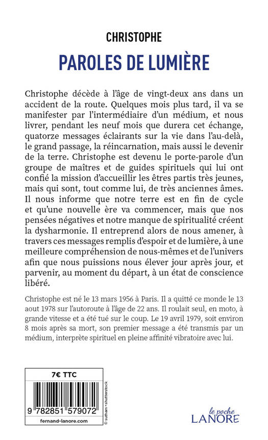 Christophe décède à l’âge de vingt-deux ans dans un accident de la route. Quelques mois plus tard, il va se manifester par l’intermédiaire d’un médium, et nous livrer, pendant les neuf mois que durera cet échange, quatorze messages éclairants sur la vie dans l’au-delà, le grand passage, la réincarnation, mais aussi le devenir de la terre. Christophe est devenu le porte-parole d’un groupe de maîtres et de guides spirituels qui lui ont confié la mission d’accueillir les êtres partis très jeunes, mais qui sont, tout comme lui, de très anciennes âmes. Il nous informe que notre terre est en fin de cycle et qu’une nouvelle ère va commencer, mais que nos pensées négatives et notre manque de spiritualité créent la dysharmonie. Il entreprend alors de nous amener, à travers ces messages remplis d’espoir et de lumière, à une meilleure compréhension de nous-mêmes et de l’univers afin que nous puissions nous élever jour après jour, et parvenir, au moment du départ, à un état de conscience libéré.