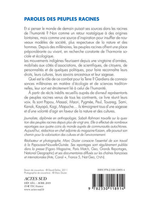 À partir de récits inédits recueillis auprès de dix-neuf représentants de peuples racines venus de tous les continents, ce livre réunit leurs voix. Ils sont Papou, Massaï, Maori, Pygmée, Peul, Touareg, Sami, Kanak, Kayapó, Kogi, Mapuche... ils témoignent tous d'une sagesse et d'une volonté d'agir en faveur de la nature et des cultures.