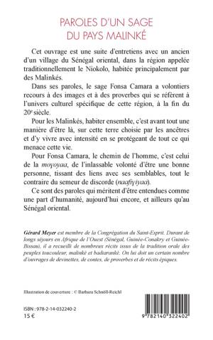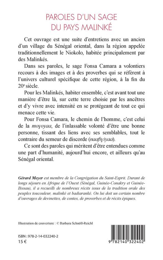 Cet ouvrage est une suite d'entretiens avec un ancien d'un village du Sénégal oriental, dans la région appelée traditionnellement le Niokolo, habitée principalement par des Malinkés. Dans ses paroles, le sage Fonsa Camara a volontiers recours à des images et à des proverbes qui se réfèrent à l'univers culturel spécifique de cette région, à la fin du 20e siècle. Pour les Malinkés, habiter ensemble, c'est avant tout une manière d'être là, sur cette terre choisie par les ancêtres et d'y vivre avec intensité en se protégeant de tout ce qui menace cette vie. Pour Fonsa Camara, le chemin de l'homme, c'est celui de la mo oyaa, de l'inlassable volonté d'être une bonne personne, tissant des liens avec ses semblables, tout le contraire du semeur de discorde (naafi iyaa). Ce sont des paroles qui méritent d'être entendues comme une part d'humanité, aujourd'hui encore, et ailleurs qu'au Sénégal oriental.