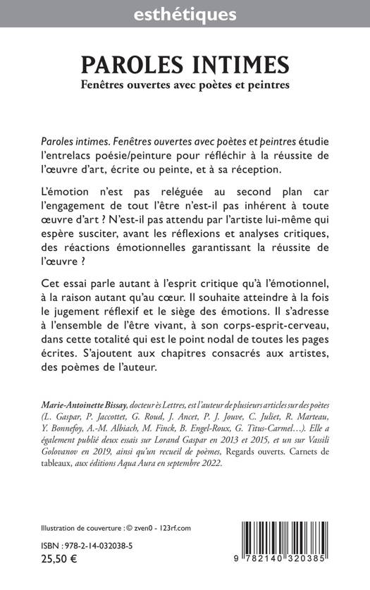 Cet ouvrage étudie l'entrelacs poésie/peinture pour réfléchir à la réussite de l'uvre d'art, écrite ou peinte, et à sa réception. L'émotion n'est pas reléguée au second plan car l'engagement de tout l'être n'est-il pas inhérent à toute uvre d'art ? N'est-il pas attendu par l'artiste lui-même qui espère susciter, avant les réflexions et analyses critiques, des réactions émotionnelles garantissant la réussite de l'uvre ? Cet essai parle autant à l'esprit critique qu'à l'émotionnel, à la raison autant qu'au cur. Il souhaite atteindre à la fois le jugement réflexif et le siège des émotions. Il s'adresse à l'ensemble de l'être vivant, à son corps-esprit-cerveau, dans cette totalité qui est le point nodal de toutes les pages écrites. S'ajoutent aux chapitres consacrés aux artistes, des poèmes de l'auteur.