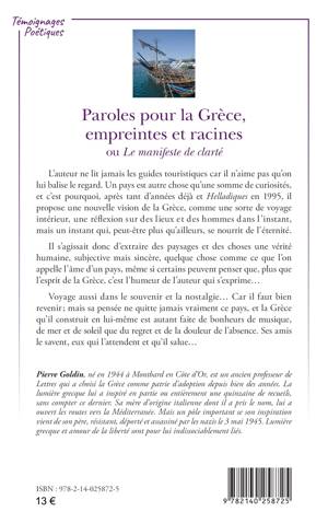 L’auteur ne lit jamais les guides touristiques car il n’aime pas qu’on lui balise le regard. Un pays est autre chose qu’une somme de curiosités, et c’est pourquoi, après tant d’années déjà et Helladiques en 1995, il propose une nouvelle vision de la Grèce, comme une sorte de voyage intérieur, une réflexion sur des lieux et des hommes dans l’instant, mais un instant qui, peut-être plus qu’ailleurs, se nourrit de l’éternité. Il s’agissait donc d’extraire des paysages et des choses une vérité humaine, subjective mais sincère, quelque chose comme ce que l’on appelle l’âme d’un pays, même si certains peuvent penser que, plus que l’esprit de la Grèce, c’est l’humeur de l’auteur qui s’exprime...