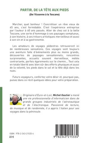 Marcher, quel bonheur ! Concrétiser un rêve vieux de 45 ans, c’est formidable. C’est l’expérience entreprise par l’auteur à 60 ans passés. Aller de chez soi à la belle Toscane, une sorte d’hommage à ses paysages somptueux, à son histoire, à ses trésors artistiques merveilleux et aussi à son vin et à sa gastronomie. Les amateurs de voyages pédestres retrouveront ici de nombreuses sensations. Ces voyages sont toujours une aventure faite d’évènements plus ou moins grands, découvertes de paysages sensationnels, rencontres surprenantes, accueils souvent merveilleux, météo contrariante, parfois égarements sur le chemin... Tout cela en totale liberté avec bien sûr des efforts physiques et aussi de la volonté, les pieds dans le sol et la tête déjà dans les nues. Futurs voyageurs, confortez votre désir et, pourquoi pas, puisez dans ce récit quelques idées pour votre préparation.