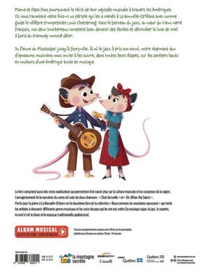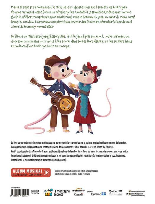 Partez en voyage avec une attachante famille d'opossums qui a roulé sa bosse partout en Amérique! Mama et Papa Poss poursuivent le récit de leur odyssée musicale à travers les Amériques. Ils nous racontent cette fois-ci un périple qui les a menés à La Nouvelle-Orléans avec comme guide le célèbre trompettiste Louis Chatstrong. Dans le berceau du jazz, au coeur du Vieux carré français, nos deux tourtereaux comptent bien devenir des étoiles et décrocher la lune de miel à bord du tramway nommé désir. Du fleuve Mississippi jusqu'à Storyville, là où le jazz à pris son envol, notre charmant duo d'opossums musiciens nous invite à les suivre, dans toutes leurs étapes, sur les sentiers hauts en couleurs d'une Amérique toute en musique. Le livre comprend aussi des notes explicatives qui permettent d'en savoir plus sur la culture musicale et les coutumes de la région. L'enregistrement de la narration du conte est suivi de deux chansons : « Chat de ruelle » et « Oh, When the Saints ». Partis pour la gloire à La Nouvelle-Orléans est le deuxième livre de la collection « Nous sommes les opossums musiciens » qui invite les enfants à découvrir différents genres musicaux et les coins de pays qui les ont vus naître (la musique cajun, le jazz, le country, le rock'n'roll, le blues et la musique traditionnelle québécoise).