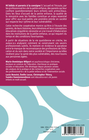 Dans les lieux d'accueil de la petite enfance, la qualité de la rencontre avec les familles constitue un enjeu essentiel pour offrir aux tout-petits une première entrée en société qui respecte leur rythme et leur vulnérabilité. Or les formations initiales des professionnels de l'enfance restent centrées sur l'accueil des enfants et sur les relations tissées avec eux. Cette recherche collaborative montre qu'être à l'écoute des parents, de leurs histoires, émotions et conceptions éducatives singulières nécessite un vrai travail d'élaboration dans les institutions de la petite enfance. À partir de situations de la vie quotidienne en crèche, les auteurs analysent comment se construisent ces savoirs professionnels et dans quelles conditions de travail.