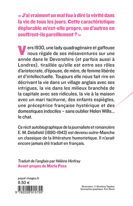 Ce récit autobiographique de la journaliste et romancière E. M. Delafi eld (1890-1943) est devenu outre-Manche un classique de la littérature humoristique. Il n'avait encore jamais été traduit en français.