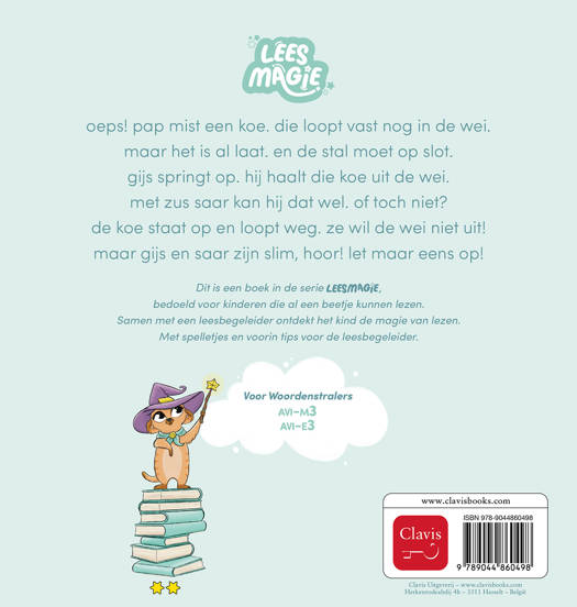 oeps! pap mist een koe. die loopt vast nog in de wei. maar het is al laat. en de stal moet op slot. gijs springt op. hij haalt die koe uit de wei. met zus saar kan hij dat wel. of toch niet? de koe staat op en loopt weg. ze wil de wei niet uit! maar gijs en saar zijn slim, hoor! let maar eens op! Dit is een boek in de serie Leesmagie, bedoeld voor kinderen die al een beetje kunnen lezen. Samen met een leesbegeleider ontdekt het kind de magie van lezen. Met spelletjes en voorin tips voor de leesbegeleider.