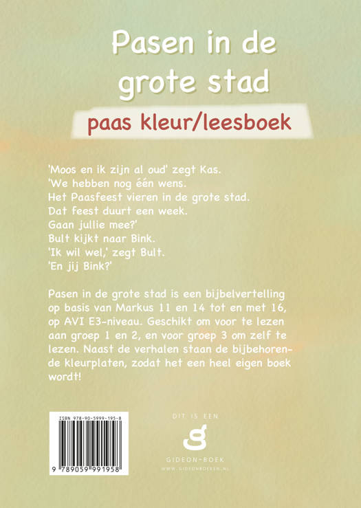 Pasen in de grote stad is een bijbelvertelling op basis van Markus 11 en 14 tot en met 16, op AVI E3-niveau. Geschikt om voor te lezen aan groep 1 en 2, en voor groep 3 om zelf te lezen. Naast de verhalen staan de bijbehorende kleurplaten, zodat het een heel eigen boek wordt!