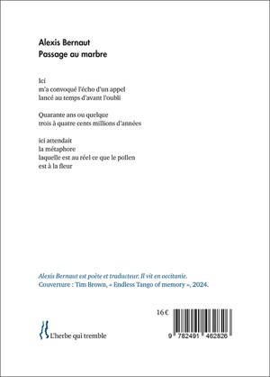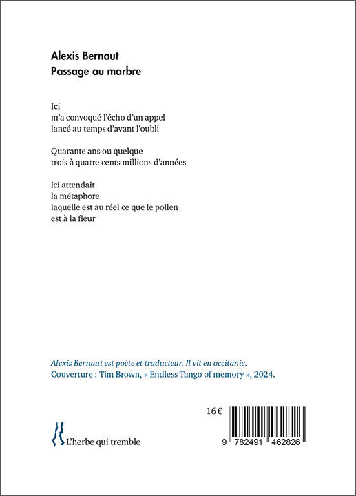 LE LIVRE La métaphore du passage au marbre dit à la fois le renouvellement, la réparation après un accident et une étape, un déplacement dans une région où les collines et les montagnes, le sol qu’on arpente sont un marbre à révéler. Une région, riche en mystique, qui se donne donc à lire comme un livre, un ensemble de signes à déchiffrer. Alexis Bernaut donne des poèmes comme on se révèle à une personne chère. Il explore comme il s’explore, proposant une lecture double des paysages extérieur et intérieur, à la fois exploration sensuelle et profonde, requérant lenteur, patience et immobilité ; et instantanéité, vitesse, fugacité.