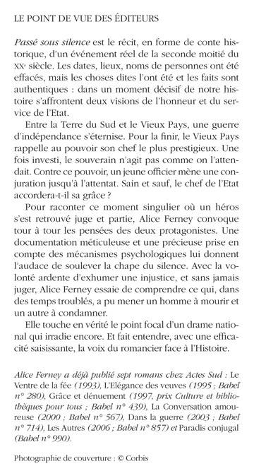 «Passé sous silence» est le récit, en forme de conte historique, d'un événement réel de la seconde moitié du XXe siècle. Les dates, lieux, noms de personnes ont été effacés, mais les choses dites l'ont été et les faits sont authentiques : dans un moment décisif de notre histoire s'affrontent deux visions de l'honneur et du service de l'Etat.
