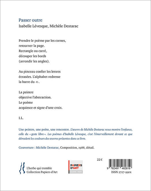 Une peintre, une poète, une rencontre. L’œuvre de Michèle Destarac nous montre l’enfance, celle du « geste libre ». Les poèmes d’Isabelle Lévesque, c’est l’émerveillement devant ce que déroulent les couleurs des œuvres présentes dans ce livre.