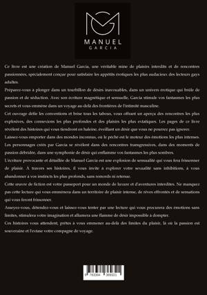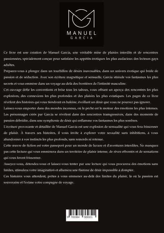 Ce livre est une création de Manuel Garcia, une véritable mine de plaisirs interdits et de rencontres passionnées, spécialement conçue pour satisfaire les appétits érotiques les plus audacieux des lecteurs gays adultes.Prépare-toi à te plonger dans un tourbillon de désirs inavouables, dans un univers érotique qui brûle de passion et de séduction. Avec son écriture magnétique et sensuelle, Garcia stimule tes fantasmes les plus secrets, t'emmenant dans un voyage au-delà des frontières de l'intimité masculine.Cet ouvrage défie les conventions et brise tous les tabous, t'offrant un aperçu des rencontres les plus explosives, des connexions les plus profondes et des plaisirs les plus extatiques. Les pages de ce livre révèlent des histoires qui te tiendront collé aux mots, éveillant un désir que tu ne pourras pas ignorer.Laisse-toi emporter dans des mondes inconnus, où le péché est le moteur des émotions les plus intenses. Les personnages créés par García se révèlent dans des rencontres transgressives, dans des moments de passion débridée, dans une symphonie de désir qui enflamme tes fantasmes les plus sombres.L'écriture provocante et détaillée de Manuel García est une explosion de sensualité qui te fera frissonner de plaisir. À travers ses histoires, il t'invite à explorer ta sexualité sans inhibitions, à t'abandonner à tes instincts les plus profonds, sans remords ni retenue.Cette oeuvre de fiction est ton passeport pour un monde de luxure et d'aventures interdites. Ne manque pas cette lecture qui t'emmènera dans un territoire de plaisir intense, de rêves effrontés et de sensations qui te feront frissonner.Assieds-toi, détends-toi et laisse-toi aller à une lecture qui te procurera des émotions sans limites, stimulera ton imagination et allumera une flamme de désir qui ne peut être apprivoisée.Ces histoires t'attendent, prêtes à t'emmener au-delà des limites du plaisir, là où la passion est souveraine et où l'extase est ton compagnon de voyage.