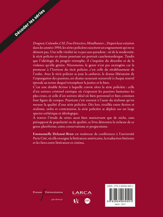 Dragnet, Columbo, CSI, True Detective, Mindhunter... Depuis leur création dans les années 1950, les séries policières suscitent un engouement qui ne se dément pas. Une telle vitalité ne va pas sans paradoxe : né de la modernité, le récit policier en dresse pourtant un portrait cauchemardesque. Tandis que l'idéologie du progrès triomphe, il s'inquiète du désordre et de la violence qu'elle génère. Néanmoins, le genre n'est pas anxiogène car la promesse à l'horizon du récit policier, c'est celle du rétablissement de l'ordre. Avec le récit policier se joue la catharsis, le drame libératoire de l'expurgation des passions, un drame rassurant renouvelé à chaque nouvel épisode au terme duquel triomphent la justice et le bien.