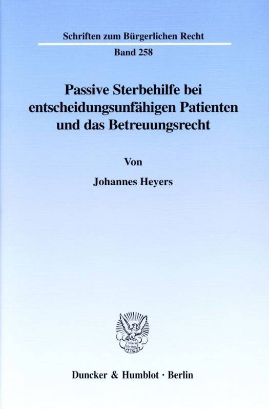 Der Autor untersucht ein wegen der raschen Fortschritte moderner medizinischer und pharmakologischer Möglichkeiten hochaktuelles und in der Öffentlichkeit wie der juristischen Fachwelt intensiv diskutiertes Problem: Unter welchen Voraussetzungen kann oder muss auf lebensnotwendige Maßnahmen bei entscheidungsunfähigen Patienten, die an einer irreversiblen und todbringenden Erkrankung leiden, verzichtet werden (passive Sterbehilfe), und wer trifft diese Entscheidung?Der Verfasser stellt zunächst die Fallgruppen der Sterbehilfe und die rechtsdogmatischen Grundlagen dar. Besondere Bedeutung kommt dem Selbstbestimmungsrecht des Patienten zu, das diesem das Recht gibt, über den Einsatz vital indizierter Maßnahmen ohne Einfluß anderer nach eigenen Wünschen und Wertvorstellungen zu entscheiden, und das auch durch krankheitsbedingten Verlust der Entscheidungsfähigkeit nicht ausgeschlossen wird. Sodann wird erläutert, welche Möglichkeiten bestehen, den Willen des Patienten trotz seiner Entscheidungsunfähigkeit durchzusetzen. Seit Inkrafttreten und Novellierung des Betreuungsrechts (1992/99) werden diesbezüglich vor allem Patientenverfügungen, Versorgevollmachten und Betreuungsverfügungen bzw. die Bestellung eines Betreuers diskutiert. Johannes Heyers entwickelt detaillierte Voraussetzungen, unter denen Patientenverfügungen und Vorsorgevollmachten wirksam und verbindlich sind.Anschließend wird erörtert, wer über den Einsatz lebenswichtiger Behandlungsmaßnahmen zu entscheiden hat, wenn der Patient für diesen Fall keine Vorsorge getroffen hat. Ob die Bestellung eines Betreuers möglich, erforderlich und sinnvoll ist, wird unter Einbeziehung denkbarer Alternativen (Willensbefolgung durch Arzt oder Ethik-Kommission) eingehend geprüft. Die Rechtspraxis erhält Hinweise, wie in Fällen von Zeitknappheit zu verfahren und wie der Aufgabenkreis eines Betreuers zu gestalten ist. Der Verf. zeigt, daß die Entscheidungsbefugnis eines Betreuers sachgerecht ist, entwickelt Entscheidungsmaßstäbe und legt umfassend dar, warum und wann diese Entscheidung in direkter bzw. analoger Anwendung des 1904 Abs. 1 BGB vormundschaftsgerichtlich genehmigt werden muß.