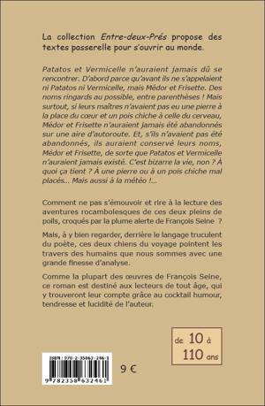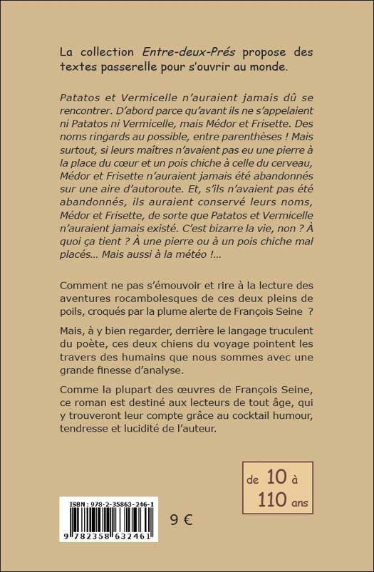 La collection Entre-deux-Prés propose des textes passerelle pour s’ouvrir au monde - "Patatos et Vermicelle n’auraient jamais dû se rencontrer. D’abord parce qu’avant ils ne s’appelaient ni Patatos ni Vermicelle, mais Médor et Frisette. Des noms ringards au possible, entre parenthèses ! Mais surtout, si leurs maîtres n’avaient pas eu une pierre à la place du cœur et un pois chiche à celle du cerveau, Médor et Frisette n’auraient jamais été abandonnés sur une aire d’autoroute. Et, s’ils n’avaient pas été abandonnés, ils auraient conservé leurs noms, Médor et Frisette, de sorte que Patatos et Vermicelle n’auraient jamais existé. C’est bizarre la vie, non ? À quoi ça tient ? À une pierre ou à un pois chiche mal placés… Mais aussi à la météo !…" - Comment ne pas s’émouvoir et rire à la lecture des aventures rocambolesques de ces deux pleins de poils, croqués par la plume alerte de François Seine ? Mais, à y bien regarder, derrière le langage truculent du poète, ces deux chiens du voyage pointent les travers des humains que nous sommes avec une grande finesse d’analyse. Comme la plupart des œuvres de François Seine, ce roman est destiné aux lecteurs de tout âge, qui y trouveront leur compte grâce au cocktail humour, tendresse et lucidité de l’auteur. Roman d'aventure, chiens, voyage, relations humains / animaux, humour et réflexion, de 10 à 110 ans