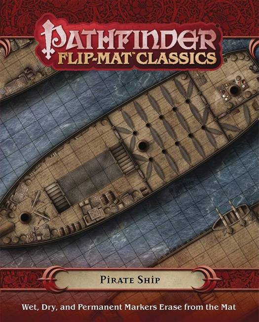 Sail the seas of adventure with Flip-Mat Classics: Pirate Ship, a gorgeous double-sided battle-scale map of the decks of a pirate ship, including cannons, sleeping quarters, cargo holds, and all the nooks and crannies you'd expect in a sailing vessel, while the flip side shows the rolling ocean. Chart a route to adventure with Flip-Mat Classics: Pirate Ship!