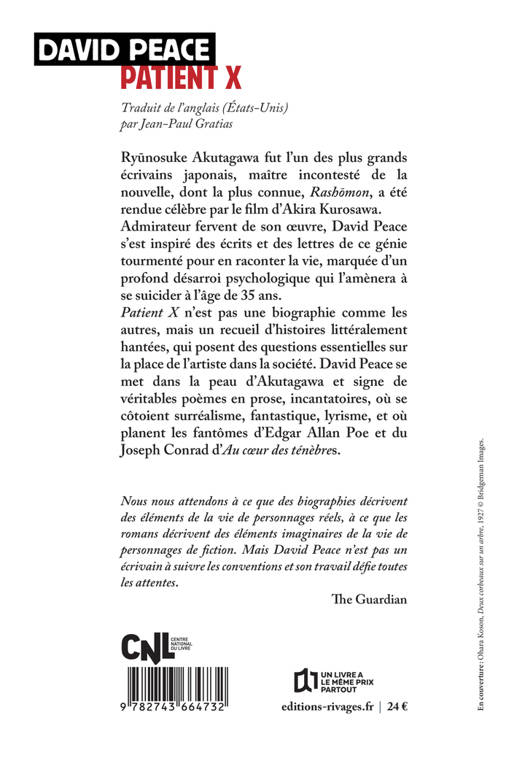 "Patient X" est un texte à part dans l'oeuvre de David Peace, né du culte qu'il voue à l'écrivain japonais Ryūnosuke Akutagawa, à qui il rend un hommage intense, passionné et obsédant. Nourrie des écrits et des lettres du maître de la nouvelle (connu en particulier pour "Rashomon", dont s'est inspiré le grand cinéaste Akira Kurosawa), ce n'est pas une biographie comme les autres, mais un recueil d'histoires littéralement hantées, une plongée dans l'univers sombre et envoûtant d'Akutagawa, par l'un des plus audacieux écrivains britanniques contemporains.