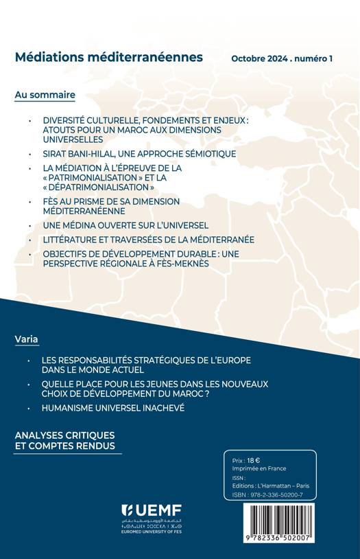 Fondée dans le cadre de la Chaire "Interculturalités méditerranéennes", labélisée par l'UNESCO en 2023, la revue Médiations méditerranéennes est emblématique de la mission qu'elle veut remplir dans le champ des recherches et des études en rapport avec l'espace méditerranéen. Les contributions de ce premier numéro abordent des thèmes variés, relatifs aux préoccupations fondamentales qui président au rôle que la revue veut jouer dans son rapport à la Méditerranée et à ses culture, défis, rêves et ambitions.