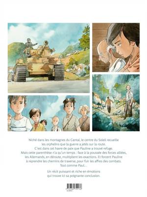 Niché dans les montagnes du Cantal, le centre du Soleil recueille les orphelins que la guerre a jetés sur la route. C’est dans cet havre de paix que Pauline a trouvé refuge. Mais cette parenthèse n’a qu’un temps : face à la poussée des forces alliées, les Allemands, en déroute, multiplient les exactions. Et forcent Pauline à reprendre les chemins de traverse, pour fuir les affres des combats. Tout comme Paul… Un récit puissant et riche en émotions qui trouve ici sa poignante conclusion.