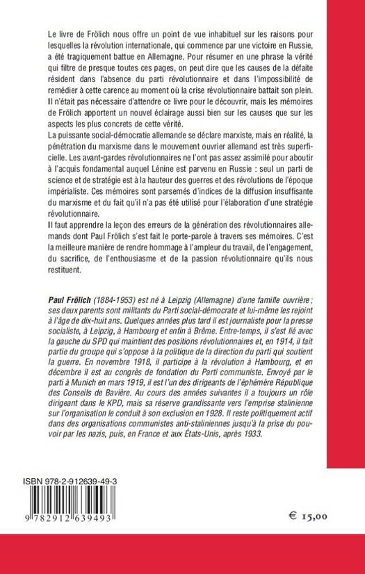 Le livre de Frölich nous offre un point de vue inhabituel sur les raisons pour lesquelles la révolution internationale, qui commence par une victoire en Russie, a été tragiquement battue en Allemagne. Pour résumer en une phrase la vérité qui filtre de presque toutes ces pages, on peut dire que les causes de la défaite résident dans l’absence du parti révolutionnaire et dans l’impossibilité de remédier à cette carence au moment où la crise révolutionnaire battait son plein. Il n’était pas nécessaire d’attendre ce livre pour le découvrir, mais les mémoires de Frölich apportent un nouvel éclairage aussi bien sur les causes que sur les aspects les plus concrets de cette vérité. La puissante social-démocratie allemande se déclare marxiste, mais en réalité, la pénétration du marxisme dans le mouvement ouvrier allemand est très superficielle. Les avant-gardes révolutionnaires ne l’ont pas assez assimilé pour aboutir à l’acquis fondamental auquel Lénine est parvenu en Russie : seul un parti de science et de stratégie est à la hauteur des guerres et des révolutions de l’époque impérialiste. Ces mémoires sont parsemés d’indices de la diffusion insuffisante du marxisme et du fait qu’il n’a pas été utilisé pour l’élaboration d’une stratégie révolutionnaire. Il faut apprendre la leçon des erreurs de la génération des révolutionnaires allemands dont Paul Frölich s’est fait le porte-parole à travers ses mémoires. C’est la meilleure manière de rendre hommage à l’ampleur du travail, de l’engagement, du sacrifice, de l’enthousiasme et de la passion révolutionnaire qu’ils nous restituent.