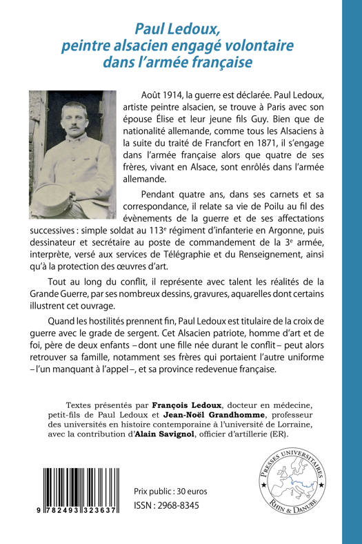Août 1914, la guerre est déclarée. Paul Ledoux, artiste peintre alsacien, se trouve à Paris avec son épouse Élise et leur jeune fils Guy. Bien que de nationalité allemande, comme tous les Alsaciens à la suite du traité de Francfort en 1871, il s’engage dans l’armée française alors que quatre de ses frères, vivant en Alsace, sont enrôlés dans l’armée allemande. Pendant quatre ans, dans ses carnets et sa correspondance, il relate sa vie de Poilu au fil des évènements de la guerre et de ses affectations successives : simple soldat au 113e régiment d’infanterie en Argonne, puis dessinateur et secrétaire au poste de commandement de la 3e armée, interprète, versé aux services de Télégraphie et du Renseignement, ainsi qu’à la protection des œuvres d’art. Tout au long du conflit, il représente avec talent les réalités de la Grande Guerre, par ses nombreux dessins, gravures, aquarelles dont certains illustrent cet ouvrage. Quand les hostilités prennent fin, Paul Ledoux est titulaire de la croix de guerre avec le grade de sergent. Cet Alsacien patriote, homme d’art et de foi, père de deux enfants – dont une fille née durant le conflit – peut alors retrouver sa famille, notamment ses frères qui portaient l’autre uniforme – l’un manquant à l’appel –, et sa province redevenue française.