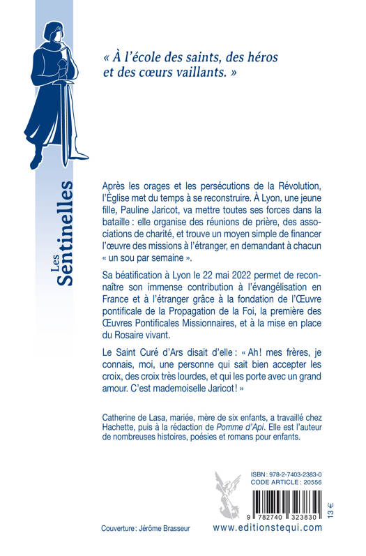 Après les orages de la Révolution, l'Église qui a été durement persécutée, met du temps à se reconstruire. C'est alors qu'une humble jeune fille, Pauline Jaricot, va mettre toutes ses forces dans la bataille : partout, elle organise des réunions de prière, des associations de charité, aide les femmes de la noblesse ruinée, visite les pauvres, les malades, et trouve un moyen simple et génial de financer l'oeuvre des missions à l'étranger, en demandant à chacun « un sou par semaine ». Elle rêve de fonder une usine modèle qui respecterait les besoins fondamentaux des ouvriers. Malheureusement escroquée par des associés sans scrupule, elle se retrouve écrasée de dettes, insultée. Elle meurt dans la misère, objet du mépris général. Aujourd'hui pourtant, on reconnaît son immense contribution à l'évangélisation en France et à l'étranger. Le Saint Curé d'Ars disait d'elle : « Ah ! mes frères, je connais, moi, une personne qui sait bien accepter les croix, des croix très lourdes, et qui les porte avec un grand amour. C'est mademoiselle Jaricot ! » A propos de l'auteur : Catherine de Lasa, mariée, mère de six enfants, a travaillé chez Hachette, puis à la rédaction de Pomme d'Api. Elle est l'auteur de nombreuses histoires, poésies et romans pour enfants.