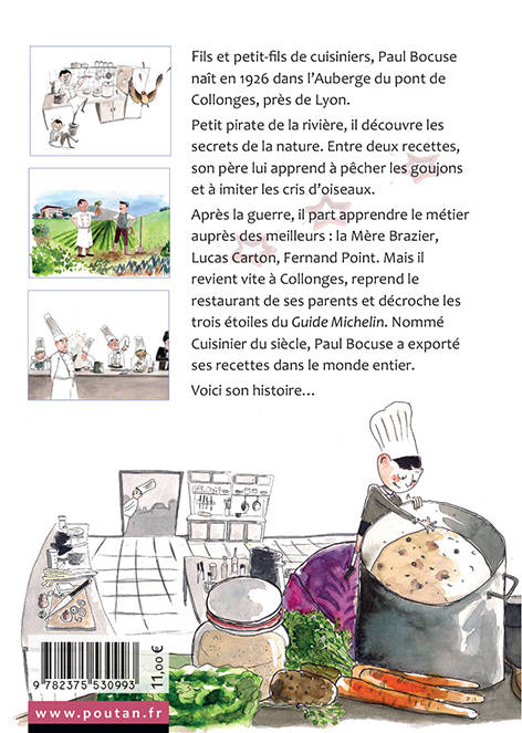 Fils et petit-fils de cuisiniers, Paul Bocuse naît en 1926 dans l’Auberge du pont de Collonges, près de Lyon. Petit pirate de la rivière, il découvre les secrets de la nature. Entre deux recettes, son père lui apprend à pêcher les goujons et à imiter les cris d’oiseaux. Après la guerre, il part apprendre le métier auprès des meilleurs : la Mère Brasier, Lucas Carton, Fernand Point. Mais il revient vite à Collonges, reprend le restaurant de ses parents et décroche les trois étoiles du guide Michelin. Nommé Cuisinier du siècle, Paul Bocuse a exporté ses recettes dans le monde entier. Voici son histoire…
