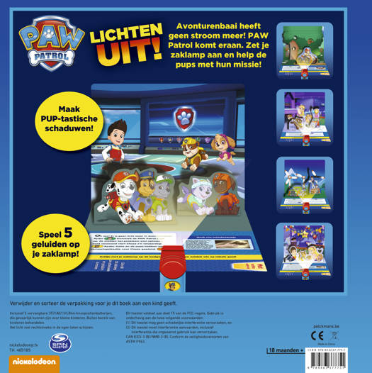 Avonturenbaai heeft geen stroom meer! PAW Patrol komt eraan. Zet je zaklamp aan en help de pups met hun missie! Met de afneembare zaklamp speel je 5 pup-tastische geluiden én schijn je echt licht op de pop-upplaten in het boek. Zie jij wie of wat er zich in de schaduwen verschuilt?