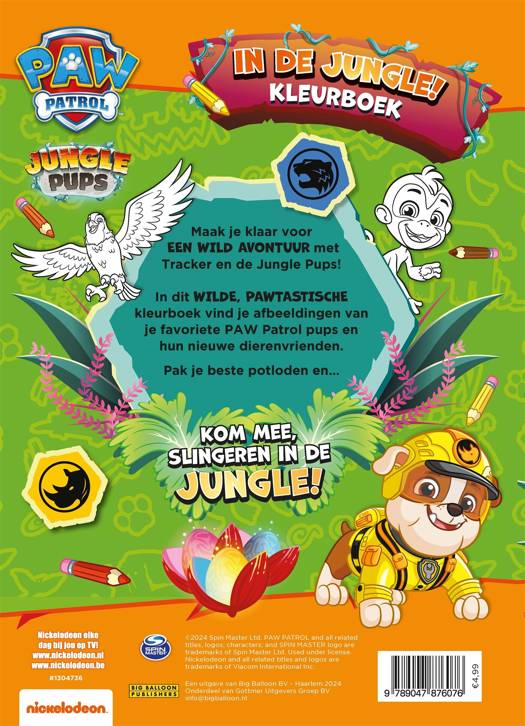 Maak je met het 'PAW Patrol in de jungle kleurboek' klaar voor een wild avontuur met Tracker en de Jungle Pups! In dit PAWtastische kleurboek vind je kleurplaten van je favoriete PAW Patrol-pups en hun nieuwe dierenvrienden. Pak je beste potloden en kom mee slingeren in de jungle!