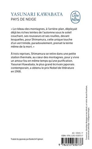 «Le rideau des montagnes, à l’arrière-plan, déployait déjà les riches teintes de l’automne sous le soleil couchant, ses rousseurs et ses rouilles, devant lesquelles, pour Shimamura, cette unique touche d’un vert timide, paradoxalement, prenait la teinte même de la mort.»