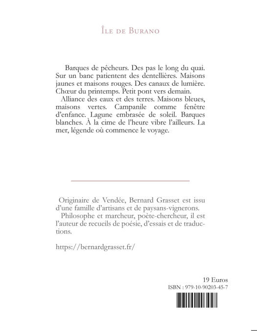 Alliance des eaux et des terres. Maisons bleues, maisons vertes. Campanile comme fenêtre d'enfance. Lagune embrasée de soleil. Barques blanches. À la cime de l'heure vibre bailleurs. La mer, légende où commence le voyage.