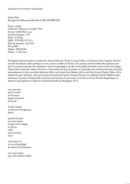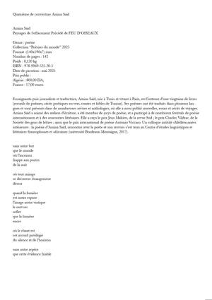 Sept questions à Amina Saïd1/ Une autobiographie en quelques mots.Très tôt, je suis partagée entre deux rives et confrontée à deux puis trois puis quatre langues. Dans chacun des livres que j’ai écrits, je tente, d’une manière ou d’une autre, de rapprocher les deux rives. Peu à peu, les territoires incertains de la poésie me révèlent la possibilité d’un « lieu » où se résoudraient les divisions, les contradictions, les dissonances.2/ Comment répondre à une injonction brusque : « Définissez la poésie. »La parole essentielle ? Un acte de résistance face aux multiples forces de destruction ? Notre manière de veiller dans la grande nuit anonyme ? La recherche de notre être spirituel ? L’infini questionnement du réel ? L’affirmation inaliénable de la vie face au néant ? 3/ Prose et poésie, la distinction a-t-elle un sens ?Le poème en prose, s’il est riche de jeux de sonorités, de rythmes, de figures de style, de métaphores, se distingue surtout du poème par l’aspect visuel, car il ignore les vers qui vont à la ligne, mais se développe de paragraphe en paragraphe. Il peut recourir à des signes visuels, comme des blancs ou la ponctuation grammaticale, pour marquer des pauses. 4/ De la forme (et du formel) en temps de crise.Le poète colombien Alvaro Mutis participait à une rencontre quand une personne dans l’assistance lui posa la question suivante : « À quoi sert la poésie dans un monde où il y a la faim, la maladie, la guerre, l’injustice, l’oppression, la torture, la violence ? » Il répondit : « Face à ce que vous évoquez, je n’ai pas trouvé d’autre solution que d’écrire de la poésie chaque jour. »5/ Quel avenir pour la poésie ?L’avenir de la poésie me paraît corrélé à celui de notre planète, donc à celui de l’humanité.6/ La part de la prosodie dans l’élaboration du poème.Le silence est la source du poème, le silence ineffable, qui est « prélude à cet état du verbe qui lui-même amorce et déclenche la parole poétique », rappelle le philosophe et grand connaisseur de la musique Vladimir Jankélévitch, pour qui « ce silence est déjà poème et musique, musique implicite et poème tacite, l’un et l’autre enveloppés dans la profondeur féconde du chaos ».Sur la page, entre les mots, les strophes, en fin de vers et jusque dans les marges, les blancs sont la respiration du poème. Ils marquent des pauses qui agissent sur le sens et sur le rythme, l’intonation, la mélodie. Ils participent de l’élaboration du poème et sont autant d’indications, d’orientations tant pour son interprétation que pour son énonciation. En partie déterminés par les mots, ces espaces de liberté suggèrent un au-delà du texte qui trouve chez le lecteur écho et résonance.« Mais il y a plus, disait le poète argentin Roberto Juarroz, dans son essai Fidélité à l’éclair : non seulement il y a cette enveloppe de silence qui porte le mot, mais chaque mot a sa propre charge intérieure de silence. C’est comme s’il y avait entre chacune de ses lettres une zone qui les unissait. Quelle est la charge du silence d’un mot ? […] Chaque mot apporte son silence ; c’est grâce à cette combinaison particulière que naît la poésie. »On devrait aborder le poème comme on approche un coquillage de son oreille pour se mettre à l’écoute de son silence « bruissant ». Ces blancs, où l’invisible se fait visible, sont l’horizon du poème, un pressentiment de l’inaccessible, de l’indicible, de l’ineffable. Ils sont un peu de nuit éblouie, ils sont un éblouissement au cœur de l’obscur. Et ce que tente le langage métaphorique de la poésie, c’est d’approcher ce qu’il y a derrière le visible, de suggérer cette autre réalité qui le hante, de rechercher quelque lumière au cœur des ténèbres.7/ La place de la traduction dans l’écriture poétique.Mon nom comme le lieu de ma naissance font référence à la rive sud de la Méditerranée, et j’écris en français, qui est ma langue maternelle. Toutefois, la langue arabe irrigue la poésie que j’écris, si bien que mon poème s’écrit entre deux langues. « Une poésie arabe en langue française », a pu dire le poète tunisien Moncef Ghachem. Selon le poète, essayiste et traducteur Claude Esteban, longtemps partagé entre le français et l’espagnol, « seule l’expression assidûment vécue d’une étrangeté, dirai-je d’une altérité à sa propre langue, peut rendre compte, au plus profond de l’esprit, de la notion d’exil » (Le Partage des mots).Écrire de la poésie, c’est écrire / traduire l’exil, l’absence, l’errance. En témoignent mes recueils, hantés par les paysages originels, les allers et retours entre les rives, la recherche du lieu. Car le poète vit une triple absence : du lieu qu’il a laissé, dans le lieu qu’il s’est créé, du lieu qu’il cherche et qui est toujours ailleurs, ou nulle part. L’écriture poétique m’a suggéré un espace entre deux mondes, un entre-deux. Si les langues sont une ouverture sur d’autres cultures, je suis attachée à la parole poétique en ce qu’elle est une parole universelle.Ma connaissance de l’anglais m’a permis de découvrir les poètes anglophones, et, plus tard, de traduire en français une partie de l’œuvre d’un romancier philippin, José F. Sionil. Poésie et traduction sont des actes créateurs. Comme le poète, le traducteur est en quête du mot juste et prête toute son attention à la langue. Comme le poème, la traduction est toujours inachevée, jamais définitive. Et comme le poème, le texte original d’une œuvre littéraire possède son rythme propre et conserve une part de silence, de mystère, quelque chose qui serait de l’ordre de l’indicible, de l’insaisissable, de l’incommunicable, et donc de l’intraduisible.