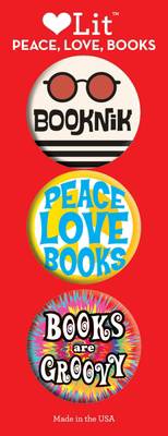 . . . or your backpack, tote, or lapel. This 3-pack button assortment for book lovers includes "Peace, Love, Books," "Booknik," and "Books Are Groovy." Buttons are 1.25 inches wide.