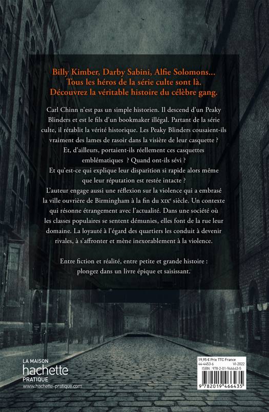 Ils sont tous là : Billy Kimber, Darby Sabini et Alfie Solomons Les Peaky Blinders, le gang de Birmingham, sont devenus célèbres dans le monde entier depuis que leur histoire a été romancée dans une série télévisée. Carl Chinn n’est pas un simple historien. Il descend d’un Peaky Blinders et est le fils d’un bookmaker illégal. Partant de la série et de ses scènes culte, il rétablit la vérité historique. Les Peaky Blinders cousaient-ils vraiment des lames de rasoir dans la visière de leur casquette ? Et, d’ailleurs, portaient-ils réellement ces casquettes emblématiques ? Quand ont-ils sévi ? Et qu’est-ce qui explique leur disparition si rapide alors même que leur réputation est restée intacte ? L’auteur engage aussi une réflexion sur la violence qui a embrasé la ville ouvrière de Birmingham à la fin du xixe siècle. Une réflexion qui résonne étrangement avec l’actualité. Dans une société où les classes populaires se sentent démunies, elles font de la rue leur domaine. La loyauté à l’égard des quartiers les conduit à devenir rivales, à s’affronter et mène inexorablement à la violence. Pourtant, la population qui soutenait tacitement les Peaky Blinders a fini par basculer du côté de la police, avant même que la Première Guerre mondiale ne mette un terme aux agissements du gang.