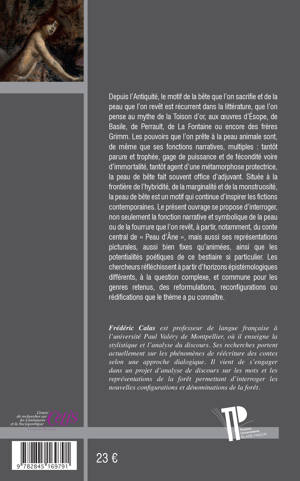 Depuis l'Antiquité, le motif de la bête que l’on sacrifie et de la peau que l’on revêt est récurrent dans la littérature, notamment dans les mythes, les fables et les contes, que l’on pense au mythe de la Toison d’or, à Ésope, à Basile, à Perrault, à La Fontaine ou encore aux frères Grimm. Les pouvoirs que l’on prête à la peau ou à la fourrure animale sont, de même que ses fonctions narratives, multiples: tantôt parure et trophée, gage de puissance et de fécondité voire d’immortalité, tantôt agent d’une métamorphose protectrice, la peau de bête en général et la peau de l’âne en particulier, font souvent office d’adjuvant. Située à la frontière de l’hybridité, de la marginalité et de la monstruosité, la peau de bête est un motif qui continue d’inspirer des fables et des fictions contemporaines. Le présent ouvrage se propose d’interroger, de manière diachronique, non seulement la fonction narrative et symbolique de la peau ou de la fourrure que l’on revêt, à partir, notamment, du conte central de « Peau d’Âne », mais aussi ses représentations picturales, aussi bien fixes qu’animées, ainsi que les potentialités poétiques de ce bestiaire si particulier, tant la fourrure suscite, comme attribut de l’animalité, tout autant fascination (érotique ou taxidermique) que répulsion. Les chercheurs réfléchissent à partir d’horizons épistémologiques différents, à la question complexe, et commune pour les genres retenus, des réappropriations, reformulations, reconfigurations ou rédifications que le thème a pu connaître, et qui pourra être abordée sous l’angle de la transtextualisation et de la transmédialité.