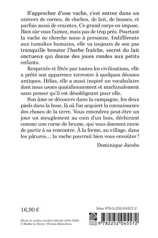 S'approcher d'une vache, c'est entrer dans un univers de cornes, de cloches, de lait, de bouses, et parfois aussi de craintes. Ce grand corps en impose. Bien sur vous l'aimez, mais pas de trop pres. Pourtant la vache ne cherche noise a personne. Indifferente aux tumultes humains, elle va toujours de son pas tranquille brouter l'herbe fraiche, secret du lait onctueux qui donne des joues rondes aux petits enfants. Respectee et fetee par toutes les civilisations, elle a prete son apparence terrestre a quelques deesses antiques. Helas, elle a aussi inspire un vocabulaire dont nous usons quotidiennement et machinalement sans penser qu'il est desobligeant pour elle. Son ame se decouvre dans la campagne, les deux pieds dans la boue, la ou l'on acquiert la connaissance des choses de la terre. Vous entendrez peut-etre un jour un meuglement au coin d'un bois, dechirant comme une corne de brume, qui vous donnera envie de partir a sa rencontre. A la ferme, au village, dans les patures... la vache pourrait bien vous envouter ! Dominique Jacobs