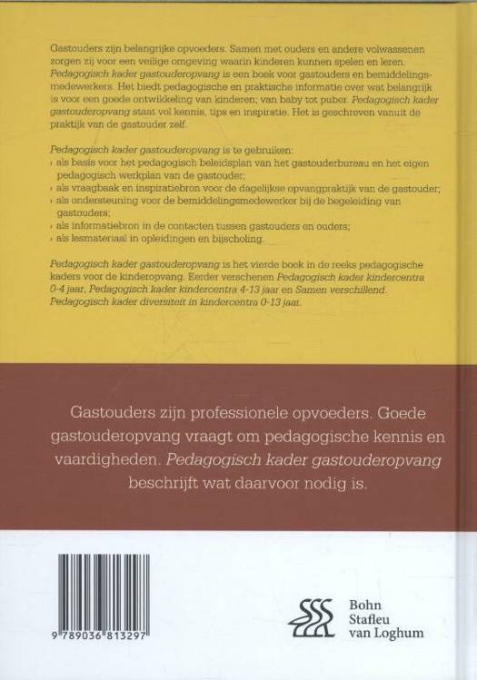 Pedagogisch kader gastouderopvang is een boek voor gastouders en bemiddelingsmedewerkers. Het biedt pedagogische en praktische informatie over wat belangrijk is voor een goede ontwikkeling van kinderen; van baby tot puber. 'Pedagogisch kader gastouderopvang' staat vol kennis, tips en inspiratie. Het is geschreven vanuit de praktijk van de gastouder zelf.