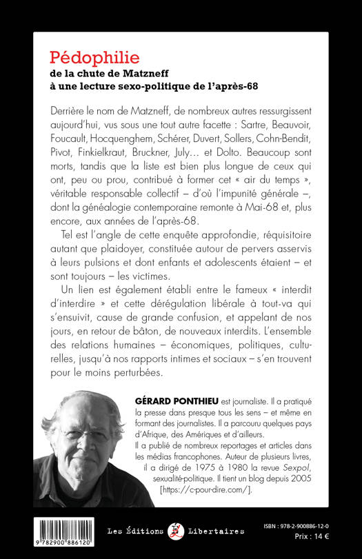 Derrière le nom de Matzneff, de nombreux autres ressurgissent aujourd'hui, vus sous une tout autre facette : Sartre, Beauvoir, Foucault, Hocquenghem, Schérer, Duvert, Sollers, Cohn-Bendit, Pivot, Finkielkraut, Bruckner, July... et Dolto. Beaucoup sont morts, tandis que la liste est bien plus longue de ceux qui ont, peu ou prou, contribué à former cet air du temps, véritable responsable collectif - d'où l'impunité générale-, dont la généalogie contemporaine remonte à Mai-68 et, plus encore, aux années de l'après-68. Tel est l'angle de cette enquête approfondie, réquisitoire autant que plaidoyer, constitués autour de pervers asservis à leurs pulsions et dont enfants et adolescents étaient - et sont toujours - les victimes. Un lien est également établi entre le fameux interdit d'interdire et cette dérégulation libérale à tout-va qui s'est ensuivie, cause de grande confusion, et appelant de nos jours, en retour de bâton, de nouveaux interdits. L'ensemble des relations humaines - économiques, politiques, culturelles, jusqu'à nos rapports intimes et sociaux - s'en trouvent pour le moins perturbées.
