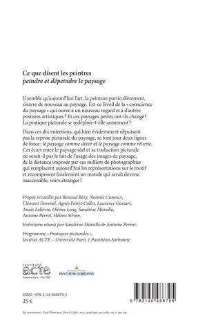 Il semble qu'aujourd'hui l'art, la peinture particulièrement, s'ouvre de nouveau au paysage. Est-ce l'éveil de la « conscience du paysage » qui ouvre à un nouveau regard et à d'autres postures artistiques ? Et ces paysages peints ont-ils changé ? La pratique picturale se redéploie-t-elle autrement ? Dans ces dix entretiens, qui bien évidemment n'épuisent pas la reprise picturale du paysage, se font jour deux lignes de force : le paysage comme décor et le paysage comme rêverie. Cet écart entre le paysage réel et sa traduction picturale ne serait-il pas le fait de l'usage des images de paysage, de la distance imposée par ces milliers de photographies qui remplacent aujourd'hui les représentations sur le motif et recomposent finalement un monde qui serait devenu inaccessible, voire étranger ?