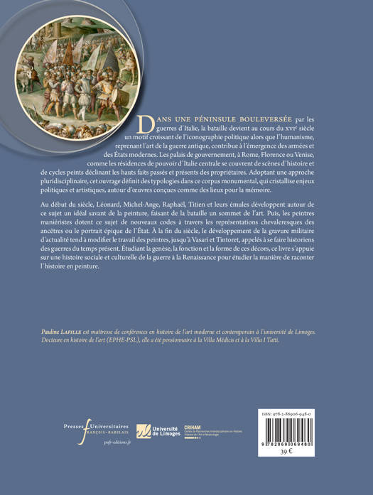 Au début du siècle, Léonard, Michel-Ange, Raphaël, Titien et leurs émules développent autour de ce sujet un idéal savant de la peinture, faisant de la bataille un sommet de l’art. Puis, les peintres maniéristes dotent ce sujet de nouveaux codes à travers les représentations chevaleresques des ancêtres ou le portrait épique de l’État. À la fin du siècle, le développement de la gravure militaire d’actualité tend à modifier le travail des peintres, jusqu’à Vasari et Tintoret, appelés à se faire historiens des guerres du temps présent. Étudiant la genèse, la fonction et la forme de ces décors, ce livre s’appuie sur une histoire sociale et culturelle de la guerre à la Renaissance pour étudier la manière de raconter l’histoire en peinture.