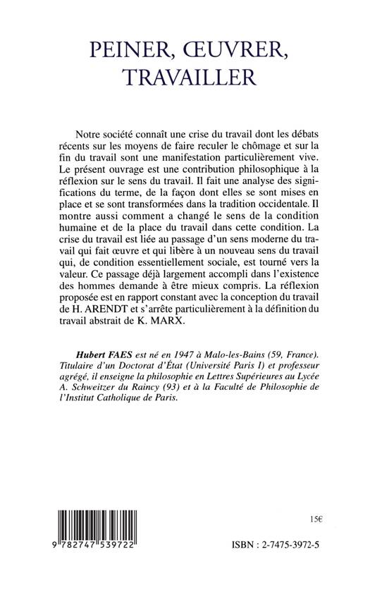 Notre société connaît une crise du travail dont les débats récents sur les moyens de faire reculer le chômage et sur la fin du travail sont une manifestation particulièrement vive. Le présent ouvrage est une contribution philosophique à la réflexion sur le sens du travail. Il montre comment a changé le sens de la condition humaine et la place du travail dans cette condition. Une réflexion en rapport constant avec la conception du travail de H. Arendt et qui s'attache aussi à la définition de travail abstrait de K. Marx.