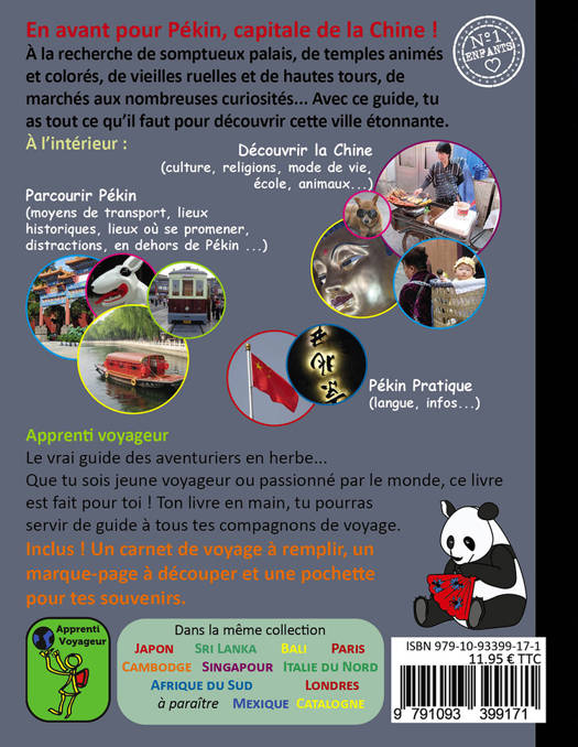 En avant pour Pékin ! Le vrai guide desaventuriers en herbe ! À la recherche de somptueux palais, detemples animés et colorés, de vieilles ruelles et de hautes tours, de marchésaux nombreuses curiosités... Destiné aux jeunes, voyageurs ou passionnés par lemonde, ce livre contient tout ce qu’il faut pour appréhender cette villefascinante et servir de guide à tous ses compagnons de voyage.Contenu : Une section pour découvrir le pays (la Chine) et ses habitants :géographie, histoire, culture, mode vie, religions, animaux... Une section devisite de la ville (Pékin) par thème : moyens de transport, lieux historiques,lieux contemporains, où se promener, où se distraire... Un chapitre En dehors dePékin : La grande Muraille et Les tombeaux des Mings. Une section pratique :langue, infos pratiques, conseils... Les petits plus : une mise enpage attractive (colorée, textes courts, nombreuses photos et illustrations),une section pour décrire ses expériences de voyage, une pochette pour conserverses souvenirs, un marque-page à découper.