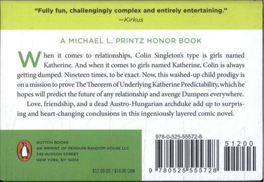 When it comes to relationships, Colin Singleton's type is girls named Katherine. And when it comes to girls named Katherine, Colin is always getting dumped. Nineteen times, to be exact. Now, on a road trip far from home, this washed-up child prodigy is on a mission to prove The Theorem of Underlying Katherine Predictability, which he hopes will predict the future of any relationship and avenge Dumpees everywhere.
