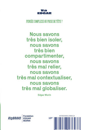 Concept de la collection "Via Edgar" : puiser dans les archives de la Fondation Edgar Morin, un texte oublié, méconnu ou inconnu du sociologue et philosophe célèbre dans le monde entier, et le soumettre à lecture et critiques. Les yeux neufs des contributrices et contributeurs approfondissent le débat . Ici, une conférence très accessible sur la pensée complexe, théorie forte de Morin, fait réagir divers interlocuteurs : philosophe, chef d'entreprise, spécialiste de l'IA militaire et ingénieur des organisations.